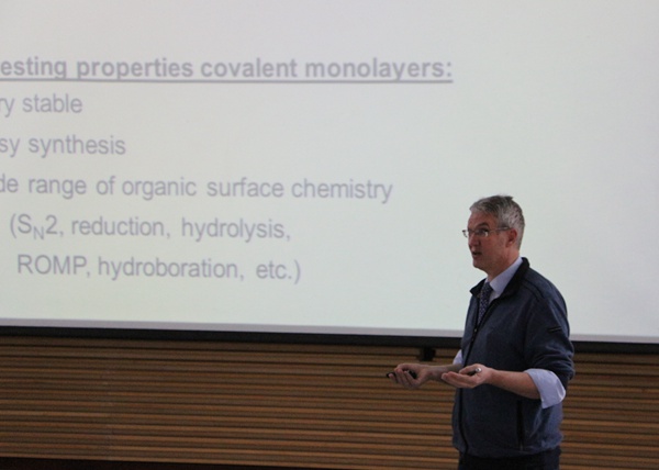 Han Zuilhof教授的“甜蜜而又浪漫的材料”引起了学生强烈的好奇心,营造了很好的氛围。学术讲座中,Han Zuilhof教授结合自身的实践经验和研究成果,理论联系实际,讲生物有机化学和表面科学完美结合,通过提出疑问再进一步解决问题、大胆猜想、逐条分析等方法,为师生带来了一场学术交流的盛宴。报告中,教授风趣幽默,不时与学院师生互动,积极引导同学们理解讲座内容。在报告中场休息时,也热情地为同学们解答疑惑,让整个讲座在温馨和谐的氛围中进行着。