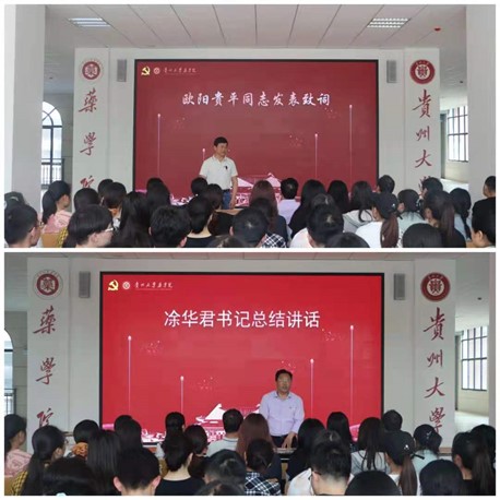 为深入开展学院党史学习教育,回顾党的光辉历程,5月12日,贵州大学药学院在崇义楼一楼大厅举行了“牢记殷切嘱托、忠诚干净担当、喜迎建党百年”“学党史、感党恩、听党话、爱祖国、强贵大” 贵州大学药学院百年党史红色经典影视剧分享活动。院党委书记凃华君、院长欧阳贵平、副书记张豫芳、副院长李焱,总支、支部书记、部分党员及发展对象代表60余人参与活动。