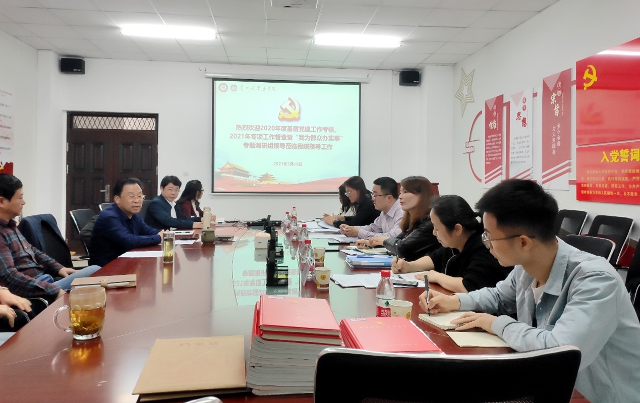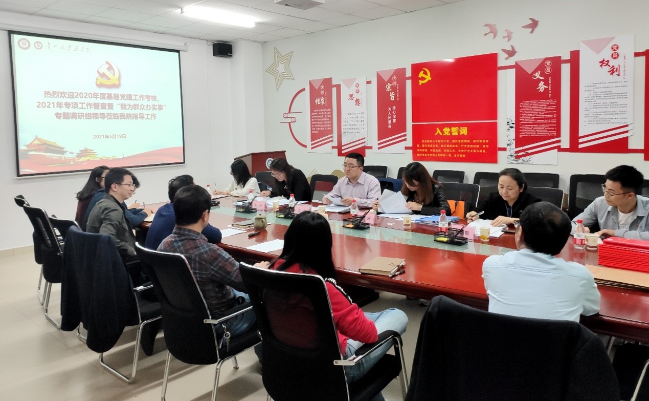 5月19日下午,外国语学院党委书记龙汶、图书馆副处级组织员王瑶、历史与民族文化学院张月老师、图书馆刘国敏老师一行四人莅临我院检查指导2020年度基层党建工作、2021年专项工作督查暨“我为群众办实事”专题调研。院党委书记凃华君、院长欧阳贵平、副院长李焱,各总支、支部书记及教师代表、党员代表10余人共同迎接了检查。