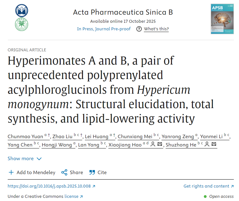 (通讯|杨岚)近日,药学院何述钟教授联合贵州医科大学郝小江团队苑春茂研究员在APSB杂志上发表题为《Hyperimonates A and B, a pair of unprecedented polyprenylated acylphloroglucinols from Hypericum monogynum: Structural elucidation, total synthesis, and lipid-lowering activity》的研究论文,该研究首次从民族药金丝桃中发现一对5/5-5/5新颖环系间苯三酚杂萜,并基于两个仿生的(3 + 2)成环策略仅用8步反应即完成了其不对称全合成。该结构通过抑制Notch和PPAR两条信号通路,在体内外表现出优异的降脂活性。该发现为NAFLD治疗提供了新的结构模板,其不对称合成策略将促进该类药物后续开发。